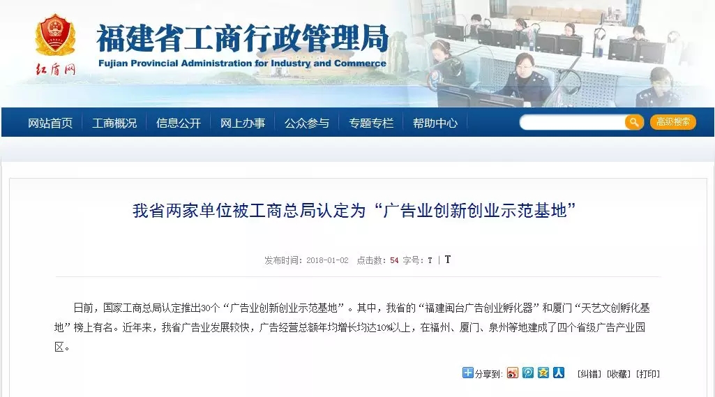 日前,在國家工商行政管理總局辦公廳出臺的《關(guān)于進一步推進廣告業(yè)創(chuàng)新創(chuàng)業(yè)有關(guān)工作的通知》(辦字【2017】209)中,由廈門市天藝傳媒股份有限公司創(chuàng)辦的“天藝文創(chuàng)孵化基地”被評定為國家級廣告業(yè)創(chuàng)新創(chuàng)業(yè)示范基地,成為廈門市2017年度唯一一家獲評廣告業(yè)創(chuàng)新發(fā)展優(yōu)秀典型企業(yè)的單位。